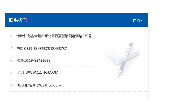 地址:常州市新北區友邦商務大廈1幢16、17層  電話:0519-85101652  傳真:0519-85112595  郵編:213022  網址:www.cz-jiayue_cn.srsy888.com  郵箱:xiajifengaa@163.com